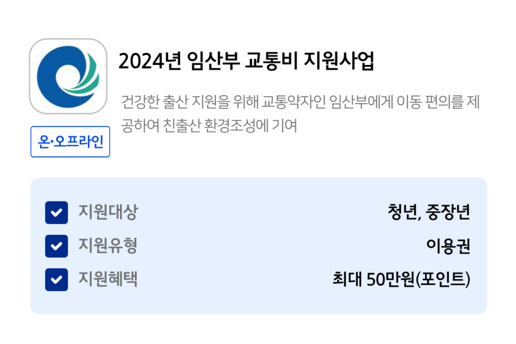 - 임산부 1인당 교통비 포인트 50만원 지원(인천e음 기본카드에 정책수당 지급)